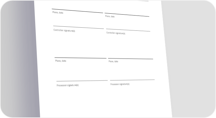 Contractual standards for Data Processing on Behalf, last revised December 8, 2014 PART 4: SIGNATURES Note: This part is only to be filled, and a signed version to be attached to the contract, if the legislation applicable to the controller demands for hand-written signatures of the parties. Place, date Place, date -------------------------------------------------------------------------------- -------------------------------------------------------------------------------- Controller signature(s) Controller signature(s) Place, date Place, date -------------------------------------------------------------------------------- -------------------------------------------------------------------------------- Processor signature(s) Processor signature(s) Page 20 of 20