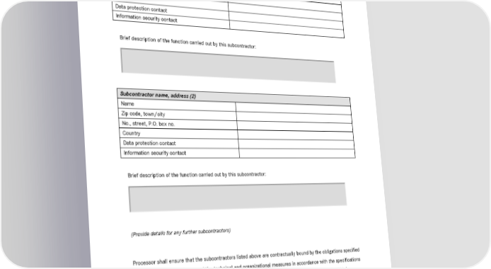 Contractual standards for Data Processing on Behalf, last revised December 8, 2014 PART 3: APPROVED SUBCONTRACTORS Subcontractor name, address (1) Name Zip code, town/city No., street, P.O. box no. Country Data protection contact Information security contact Brief description of the function carried out by this subcontractor: Subcontractor name, address (2) Name Zip code, town/city No., street, P.O. box no. Country Data protection contact Information security contact Brief description of the function carried out by this subcontractor: (Provide details for any further subcontractors) Processor shall ensure that the subcontractors listed above are contractually bound by the obligations specified in Part 1 and have implemented the technical and organizational measures in accordance with the specifications in Part 2 or can furnish proof that they have been awarded suitable certification (for example, ISO 2700x). Page 19 of 20