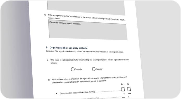 Contractual standards for Data Processing on Behalf, last revised December 8, 2014 • Regular checks carried out to ensure fully compliant use of information and IT systems .................................................................................................................. ☐ ☐ c) Please use the following field (free text) for details of additional or other measures you have implemented or if you would like to provide more specific information on the above items: (Please use additional sheet if necessary.) d) If the segregation principle is not relevant to the services subject to this Agreement, please briefly state the reasons below: (Please use additional sheet if necessary.) 9. Organizational security criteria Definition: The organizational security criteria are the rules and processes used to protect personal data. a) Who holds overall responsibility for implementing and ensuring compliance with the organizational security criteria? Controller Processor b) What action is taken to implement the organizational security criteria and who carries out this action? (Please select appropriate answers and mark with a cross, as applicable) Co Pr • Data protection responsibilities fixed in writing ............................................................ ☐ ☐ • Information security responsibilities fixed in writing ..................................................... ☐ ☐ • Appropriate information security management system in place ................................... ☐ ☐ • Appropriate incident management system in place ...................................................... ☐ ☐ • Information classification system implemented ........................................................... ☐ ☐ Page 17 of 20
