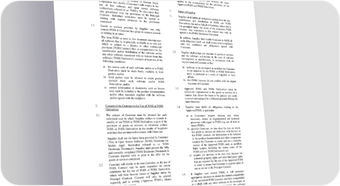 Annex Free & Open Source Software for Mobile Apps Version 1/2014 1. Scope of Application 2.5 The time and expenses of Supplier incurred in 1.1 These provisions extend the terms of the contract connection with this procedure, and the resulting relating to the development and/or supply of applications obligations and their fulfillment, will be covered by the for mobile devices ('Principal Contract') between remuneration for the goods and services; the same Supplier and Daimler AG or companies affiliated with applies to the remuneration for the provision of the Daimler AG as defined in section 15 German Stock Approved FOSS and FOSS Derivatives. Corporation Act (AktG) ('Customer') with respect to the use of free software and open source software 3. Duties of Supplier (collectively referred to as 'FOSS'). To this extent they 3.1 Supplier shall fulfill all obligations arising from the use, take precedence over the provisions of the Principal Contract. Individual deviations must be agreed in modification and distribution of FOSS and FOSS writing with express reference to the provisions Derivatives, for and on behalf of Customer, unless this is concerned. not permitted under the terms of the respective FOSS License. Any restrictions in this respect may only be 1.2 Goods or services provided by Supplier may only agreed in the FOSS Disclosure Document. contain FOSS if Customer has given its express consent in writing in advance. In addition, Supplier shall enable Customer to fulfill all The term FOSS as used in this document encompasses such obligations itself, and shall ensure strict compliance all software that is, in principle, available at no cost and with the conditions and obligations agreed with which is subject to a license or other contractual Customer. provision ('FOSS License') that, as a requirement for the 3.2 Supplier shall design and structure its goods or services, modification and/or distribution of the software and/or and the software architecture in the case of software any other software associated with or derived from this development or modifications, in accordance with the software ('FOSS Derivative'), contains at least one of the requirements of Customer so that following conditions: a) software to be developed or modified for Customer a) the source code of such software and/or of a FOSS is not impaired by the FOSS or FOSS Derivatives Derivative must be made freely available to third used, in particular as a result of 'copyleft' or 'viral' parties; and/or effects. b) third parties must be allowed to create products b) the FOSS Licenses do not conflict with the digital derived from such software and/or FOSS signature of Customer. Derivatives; and/or c) certain information or documents, such as license 3.3 Approved FOSS and FOSS Derivatives must be text, must be included in the product documentation technically implemented in the goods or services in a and/or other materials supplied with the software manner that allows for them to be quickly and easily and/or agreed with the recipients. removed and replaced by a different product offering the same functions. 2. Consent of the Customer to the Use of FOSS or FOSS 3.4 Supplier must fulfill all obligations relating to the Derivatives Approved FOSS, in particular 2.1 The consent of Customer must be obtained for each a) at Customer's request, disclose and, where individual case in which Supplier wishes or intends to necessary, amend its organizational and technical modify or use FOSS or FOSS Derivatives as part of the processes with regard to FOSS (e.g. use of tools to provision of goods or services, or otherwise include detect FOSS), FOSS or FOSS Derivatives in the results of Supplier's b) provide Customer, no later than the date on which activities that are intended to remain with Customer. the goods or services are delivered, with the text of Supplier shall use the latest form provided by Customer the FOSS Licenses, the information to be included ('Free & Open Source Software (FOSS) Disclosure for in the product documentation and other components Mobile Apps', hereinafter referred to as 'FOSS required by Customer to create and use a workable Disclosure Document'). Supplier must present the fully version of the Approved FOSS (such as modified and correctly completed FOSS Disclosure Document to build scripts), including the source codes of the Customer together with or prior to the offer for the FOSS and any FOSS Derivatives and goods or services concerned. c) acquire and provide, at its own cost, licenses for industrial property rights and other third-party rights 2.2 Customer will decide at its own discretion on the use of that are required for the use of the Approved FOSS FOSS. Consent may be made dependent on certain in order to ensure that Customer is granted rights of conditions for the use of FOSS or FOSS Derivatives, use as set out in the Principal Contract. which will then become duties of Supplier under the Principal Contract. Consent will only be granted 3.5 If Supplier uses several FOSS, it will undertake expressly and in writing ('Approved FOSS'); silence appropriate measures to ensure the mutual compatibility does not imply consent. of the individual FOSS Licenses and their compatibility as a whole with any other software to be developed or 2.3 Supplier shall submit a fully and correctly completed used, e.g. by designing and structuring the software FOSS Disclosure Document for the current status of accordingly. goods or services when providing the goods or services. This is a prerequisite for the provision of the goods or 3.6 To the extent required by the respective FOSS Licenses services in full and according to the contract. or if so requested by Customer, Supplier shall provide the respective FOSS projects with the FOSS Derivatives 2.4 This procedure will apply again in the event of any created by Supplier. This will always be done in prior changes to the FOSS or FOSS Derivatives, even if the consultation with C