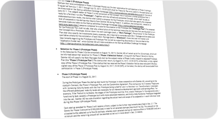 10 Startup adVANce Challenge | Startup Partnership by Mercedes-Benz Vans pursuant to the Cooperation Agreement. Daimler AG has sole discretion regarding the actual level and scope of its cooperation in each individual case. The business model that is part of the Concept must illustrate how the startup plans to gain profits from the Product. The startup will receive a Grant of € 10,000 for participating in Phase 2 (see Sec. 2.6 for more details), in case the requirements described in Sec. 2.7 are met. The startup shall submit its refined and completed Concept by the end of the period for the Call for Phase 3, i.e. July 23, 2017, 23:59 (CET) at the latest. Phase 3: Prototype Phase Call for Phase 3 (Prototype Phase) Startups that have participated in Phase 2 (Concept Phase) can file their application for participation in Phase 3 during a filing period from July 7, 2017 through July 23, 2017, 23:59 (CET) (Call for Phase 3). The entry point for the application will be announced on the Startup adVANce Challenge Homepage (http://startup-advance.mercedes-benz.com) at the end of June 2017. The subject matter of Phase 3 is the conversion of the Concept into a functionally tested prototype that is ready for a field test run (the “Prototype”). Together with the refined and completed Concept, which shall include an elaborated business model, the startup shall submit a proposal for the Prototype, which shall also specify the proposed level of cooperation the startup may require from Daimler AG during Phase 3. In addition, the startup shall, based on a template made available via the Startup adVANce Challenge Homepage (http://startup-advance.mercedes- benz.com/apply-now/) prepare a proposal for a plan for the creation of the Prototype (the “Prototype Plan”).The proposal for the Prototype Plan shall include, inter alia, a description of the technical measures and features that are required to turn the Concept into a Prototype, broken down into work packages (each, a “Work Package”). The proposal for the Prototype Plan shall also specify the investments (costs, expenses, etc.) required to complete each Work Package and the dates and qualitative criteria for the completion of each Work Package (each a “Milestone”). More detailed information and requirements regarding the Prototype and Prototype Plan as well as supporting documents will be provided in the “Application Guidelines”, which Daimler AG will make available on the Startup adVANce Challenge Homepage (http://startup-advance.mercedes-benz.com/apply-now/). Selection for Phase 3 (Prototype Phase) In the Selection for Phase 3 (to be completed on August 15, 2017), Daimler AG will select up to five (5) startups, which will be informed about their selection for Phase 3 (“Phase 3 Selection Notice”). Along with the Phase 3 Selection Notice, Daimler AG will specify the Work Packages that shall be the subject matter of Phase 3 and a respective adjusted Prototype Plan (the “Phase 3 Prototype Plan”).The startup shall return, by August 24, 2017, 23:59 (CET), at the latest, a duly signed copy of the Phase 3 Prototype Plan. If the startup that has received the Phase 3 Selection Notice does not submit the duly signed copy of the Phase 3 Prototype Plan by August 24, 2017, 23:59 (CET), at the latest, the startup will be excluded from participation in Phase 3 (Prototype Phase). Phase 3 (Prototype Phase) The start of Phase 3 is August 25, 2017. During the Prototype Phase the startup shall build the Prototype in close cooperation with Daimler AG, according to the startup’s Concept, the Phase 3 Prototype Plan, and the Cooperation Agreement. The startup shall build several Prototypes with increasing maturity levels with the final Prototype being suited for use in a field test run. Therefore tests in-between the different prototypes’ maturity levels are necessary for an interactive development approach and learning effect. For example, if the Product is hardware, the stages of the Prototype could be, first, a basic Prototype for the ergonomic and / functionality test, second, a Prototype built with more advanced materials, and third, a fully functional Prototype integrated into the van. Daimler AG has sole discretion regarding the actual level and scope of its cooperation in each individual case during this Phase 3 (Prototype Phase). Each startup selected for Phase 3 will receive a Grant, subject to the further requirements described in Sec. 2.7. The Grants for Phase 3 amount to € 900,000 (net) in total for all selected startups (maximum five (5)). This amount will be allocated to the selected up to five (5) startups, whereby each selected startup will receive a Grant of € 80,000 (net) as a minimum and the remaining amount will be awarded as set out in more detail in Sec. 2.6 below. 2. ADDITIONAL TERMS AND CONDITIONS 2.1. Applicability of terms and conditions 1. The provisions in these terms and conditions apply to all Phases of the Startup adVANce Challenge and the relevant activities of Daimler AG and the startup in each Phase.