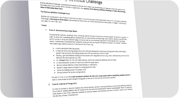 Startup adVANce Challenge | Startup Partnership by Mercedes-Benz Vans 5 Four potential cooperation models on the long-run: Mercedes-Benz Vans may become a customer of the startup with regard to the Product; Mercedes-Benz Vans may retain the startup for R&D projects or any other commissioning; Mercedes-Benz Vans may become a strategic partner and invest in the startup with taking shares; and Mercedes-Benz Vans may offer the shareholders of the startup an exit and acquire the startup. The further potential benefits and potential cooperation models are beyond the scope of the Startup adVANce Challenge and subject to further agreements between Daimler AG and the relevant startup. 1.3. Startup adVANce Challenge Startup adVANce Challenge is planned and realized by Daimler AG to foster new partnerships with startups around the world for the Mercedes-Benz Vans brand. Within Daimler’s organization, the sponsor of the Startup adVANce Challenge is Volker Mornhinweg, Head of Mercedes-Benz Vans. The Startup adVANce Challenge focus Daimler AG is looking for new Products that have not been in the core business of Mercedes-Benz Vans so far. The Startup adVANce Challenge is focusing on three topics represented by three tracks, as further described here below (each, a “Track”). Each startup can apply for one Track only. Tracks 1. Track A: Revolutionizing Cargo Space Transportation vehicles, especially vans, are being used for the last mile delivery of several goods like parcels or grocery. In order to cover the increasing delivery demand the van itself and the existing cargo space need to become more efficient, both in terms of using the available cargo volume as well as the enhanced organization of the goods within the cargo space. Furthermore, complementary hardware to the van that can support the delivery process is of interest. Therefore, new technology solutions and are in the focus of this Track, e.g.: a new automated shelving system; a modular active cooling system/box with individual temperature zones per cooling system/box and a plug-in system that connects the cooling system box with the shelving or the van itself; flexible, light and foldable loading carriers/boxes with integrated sensors (e.g. shock, temperature), which can be left with the end customers as well; an intelligent dolly for the last meter delivery, which can overcome obstacles and stairways; an automatization system to load and unload the cargo space; delivery robots/drones/rovers (free floating vs. stationary); dynamic cargo space concepts for changing parcel sizes; container loading system for parcels; and (home) lockers for parcels and groceries. The aim of Track A is to find new hardware solutions for the van’s cargo space itself or everything needed around to load or/and unload or/and transport the goods to the van or from the van to the end customer. 2. Track B: Internet of Things (IoT) In order to connect all physical objects (like vehicle devices, sensors, shelving systems or parcels) and software solutions (like order or routing system), new IoT solutions for the last mile transportation need to be developed. These IoT solutions shall enable a (real time) interaction between all physical objects and software solutions to monitor, control, and influence the delivery process. Examples are: open onboard systems architecture that allows for easy 3rd party integration of digital components; comprehensive sensor IoT solution for tracking conditions of vehicle payload; fleet optimized navigation routing for delivery of goods; cooperative intelligent transport systems; route optimization; integration of end-customer within the overall delivery process to create new values; intelligent devices/systems to identify, locate and track transported goods or people; and platforms that enable an active interaction between seller, customer, deliverer and anyone else involved in the last mile transportation process.