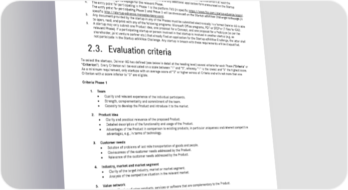 Startup adVANce Challenge | Startup Partnership by Mercedes-Benz Vans 11 2. In the event of a conflict between the terms of the Cooperation Agreement and these terms and conditions, the terms of the Cooperation Agreement shall prevail. 2.2. General requirements for the application 1. Applications must be written in English language, which is the official language for all Phases. Submissions in any other language will not be evaluated. 2. Applications must be sent by the respective deadlines (see Sec. 1.5), i.e., proposals received after 23h59 (GMT) of each deadline must be considered non-eligible and will not be sent to evaluation. 3. The application for each Phase must be signed by a lawful representative of the startup and contain at least the information that is requested in the application form and any additional application form announced on the Startup adVANce Challenge homepage for the relevant Phase. 4. The entry point for participating in Phase 1 is the platform F6S (in specific https://www.f6s.com/startup-advance/apply). The entry point for participating Phase 2 and Phase 3 will be announced on the Startup adVANce Challenge homepage (in specific http://startup-advance.mercedes-benz.com). 5. Any document provided by the startup in any of the Phases must be submitted electronically in a format Daimler AG is able to open, read, and print with any of the following programs: Microsoft Office programs, PDF or STEP or JT files for CAD. 6. A startup may only submit one Product Idea, one proposal for a Concept, and one proposal for a Prototype (as per the relevant Phase). If a participating startup or person involved in that startup is involved in another startup (e.g. as shareholder, joint venture partner etc.) that already filed an application for the Startup adVANce Challenge, the latter shall not participate in the Startup adVANce Challenge. Any startup in breach with these requirements will be disqualified. 2.3. Evaluation criteria To select the startups, Daimler AG has defined (see below in detail at the heading level) several criteria for each Phase (“Criteria” or “Criterion”). Every Criterion will be evaluated on a scale between “1” and “5”, whereby “1” is the lowest and “5” the highest score. As a minimum requirement, only startups with an average score of “3” or higher across all Criteria and with not more than one Criterion with a score inferior to “3” are eligible. Criteria Phase 1 1. Team Quality and relevant experience of the individual participants. Strength, complementarity and commitment of the team. Capacity to develop the Product and introduce it to the market. 2. Product Idea Clarity and practical relevance of the proposed Product. Detailed description of the functionality and usage of the Product. Advantages of the Product in comparison to existing products, in particular uniqueness and inherent competitive advantages, e.g., in terms of technology. 3. Customer needs Solution of problems of last mile transportation of goods and people. Obviousness of the customer needs addressed by the Product. Relevance of the customer needs addressed by the Product. 4. Industry, market and market segment Clarity of the target industry, market or market segment. Analysis of the competitive situation in the relevant market. 5. Value network Identification of other products, services or software that are complementary to the Product. Quality of the innovation-eco-system underlying the Product. Dependence of the Product on any other innovations or existing products, services or software. 6. Elevator Pitch of the product idea and team (max. 3 Minutes) Quality of Product presentation. Demonstrated competence of the startup team. Criteria Phase 2 In addition to the Criteria for Phase 1, the following Criteria apply: 1. Work plan