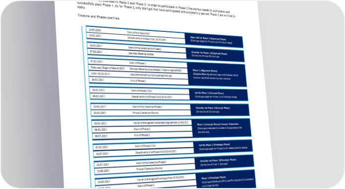 8 Startup adVANce Challenge | Startup Partnership by Mercedes-Benz Vans 1.5. Phases of the competition, grant, calls The Startup adVANce Challenge makes available a total of € 1 million (net) (in words: one million Euro) for Grant awards as further described in these terms and conditions without taking any shares of the startups. The Startup adVANce Challenge consists of three operational phases referred to as: “Phase 1” or “Alignment Phase”; “Phase 2” or “Concept Phase”; and “Phase 3” or “Prototype Phase”. The Grants will be awarded in Phase 2 and Phase 3. In order to participate in Phase 2 the startup needs to participate and successfully pass Phase 1. As for Phase 3, only startups that have participated and successfully passed Phase 2 are entitled to apply. Timeline and Phases overview: Fig.: Time Schedule for the Challenge Phases – detailed description Each of the three Phases is preceded with an application and selection process referred to as “Open Call” (in case of Phase 1) or “Call” (in case of Phases 2 and 3) and “Selection”.