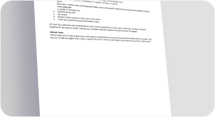 16 Startup adVANce Challenge | Startup Partnership by Mercedes-Benz Vans ANNEX 1. COST ELIGIBILITY LIMITS AND CONDITIONS APPLICABLE ONLY FOR PHASE 3 - Prototype Phase: Direct Costs The following costs are eligible for the use of the Grant: a. Staff costs, calculated considering an hourly rate according to the following formula: Cost/ Hour = [(base salary x 14 months)/ (11 months x 22 days x n hours)] where: Base salary: monthly salary (excluding paid holidays and country specific standards) and social security mandatory charges, where applicable. n: number of working hours b. Subcontracting costs. c. Equipment. d. Access to data sources or other type of information. e. Travelling, subsistence and accommodation costs. All travelling, subsistence and accommodation costs must be supported by a travel report containing information about the objectives of the occasion (event, meeting, etc.), contacts made and respective results (maximum of 2 pages). Indirect Costs Indirect costs are all those eligible costs, which cannot be identified by the startup as being directly attributed to the project. They may not include any eligible direct costs. A specific flat rate of 10% of the staff costs is to be used to calculate the indirect costs.