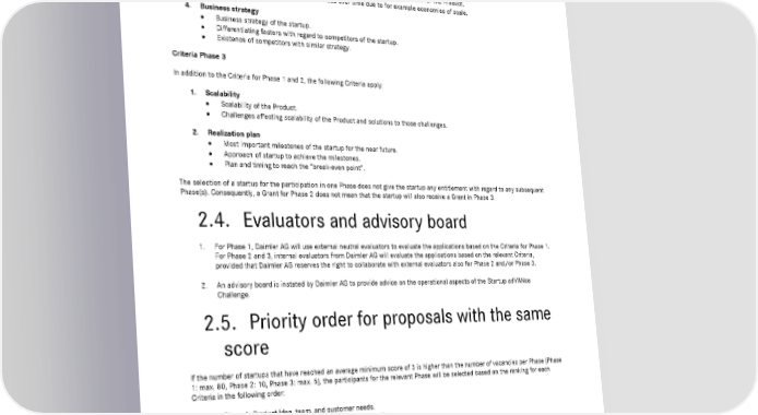 12 Startup adVANce Challenge | Startup Partnership by Mercedes-Benz Vans Coherence and effectiveness of the draft work plan for the Concept. Presented capacity and resources to implement the work plan. Credibility of the work plan to develop and place the Product in the market. 2. Resources and Competences Resources and competences needed to successfully develop the Product. Uniqueness of resources and competences to the startup. Access to all relevant resources and competences. 3. Cost structure and revenue stream Cost structure (fixed and variable costs) of startup, in particular as relevant for the Product. Ability to influence the costs and revenues over time due to for example economies of scale. 4. Business strategy Business strategy of the startup. Differentiating factors with regard to competitors of the startup. Existence of competitors with similar strategy. Criteria Phase 3 In addition to the Criteria for Phase 1 and 2, the following Criteria apply: 1. Scalability Scalability of the Product. Challenges affecting scalability of the Product and solutions to those challenges. 2. Realization plan Most important milestones of the startup for the near future. Approach of startup to achieve the milestones. Plan and timing to reach the “break-even point”. The selection of a startup for the participation in one Phase does not give the startup any entitlement with regard to any subsequent Phase(s). Consequently, a Grant for Phase 2 does not mean that the startup will also receive a Grant in Phase 3. 2.4. Evaluators and advisory board 1. For Phase 1, Daimler AG will use external neutral evaluators to evaluate the applications based on the Criteria for Phase 1. For Phase 2 and 3, internal evaluators from Daimler AG will evaluate the applications based on the relevant Criteria, provided that Daimler AG reserves the right to collaborate with external evaluators also for Phase 2 and/or Phase 3. 2. An advisory board is instated by Daimler AG to provide advice on the operational aspects of the Startup adVANce Challenge. 2.5. Priority order for proposals with the same score If the number of startups that have reached an average minimum score of 3 is higher than the number of vacancies per Phase (Phase 1: max. 80, Phase 2: 10, Phase 3: max. 5), the participants for the relevant Phase will be selected based on the ranking for each Criteria in the following order: Order for Phase 1: Product Idea, team, and customer needs. Order for Phase 2: Product Idea, work plan, and customer needs. Order for Phase 3: Product Idea, realization plan, and resources and competences. If, thereafter, the number of startups that have received the same score based on the above order (and that fulfil the requirements for the relevant Phase) is still higher than the vacancies for the relevant Phase, Daimler AG may submit the Product Idea (for Phase 1), the proposal for the Concept (for Phase 2) or the proposal for the Prototype (for Phase 3), as applicable, along with a request for a recommendation to fill the vacancies for the relevant Phase to either a third party evaluator, or an evaluation board defined by Daimler AG that would schedule an interview/speed meeting (up to 20 minutes, in personal in Stuttgart, Germany or via Skype or similar media) with the startup. The Criteria shall continue to apply.